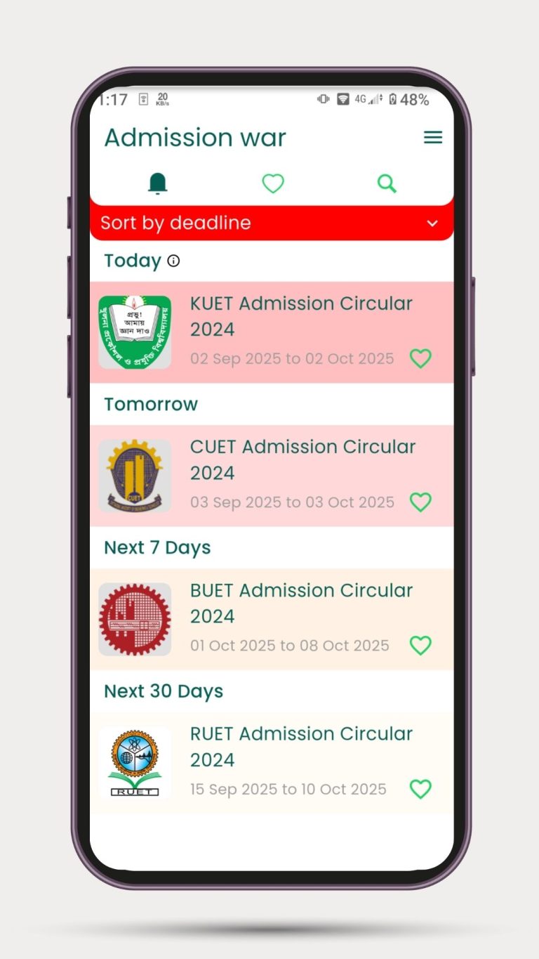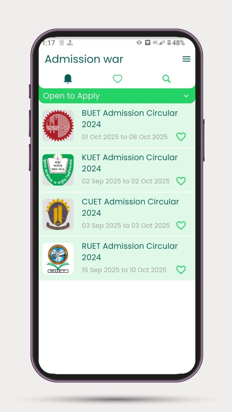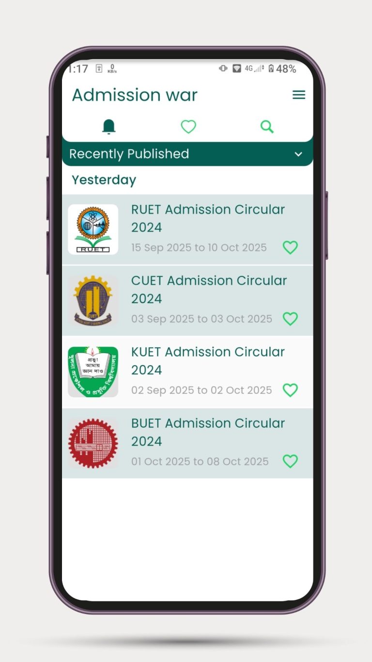 Home A mobile app that will help you in managing circulars Notifications Saved List Reminder Search Recently Published You will get all the circulars that has been published recently in latest first order. Sort By Deadline You will be able to sort the circulars that are near to deadline. Open to Apply You will get all the circulars that has been published recently in latest first order. Saved List You will get all the circulars here that you have saved. Organization You will be able to view basic information of any organization and the circulars.
